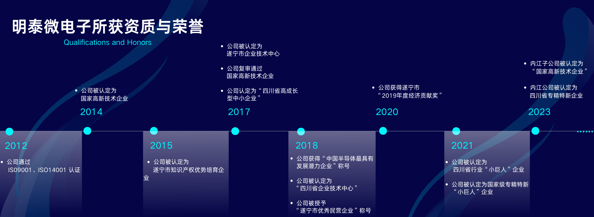 四川明泰電子科技有限公司獲得的資質和榮譽 ?2012年,公司通過ISO9001和ISO14001認證; 2014年,公司認定為“國家高新技術企業(yè)”; 2015年,公司認定為“遂寧市知識產(chǎn)權優(yōu)勢培育企業(yè)”;
